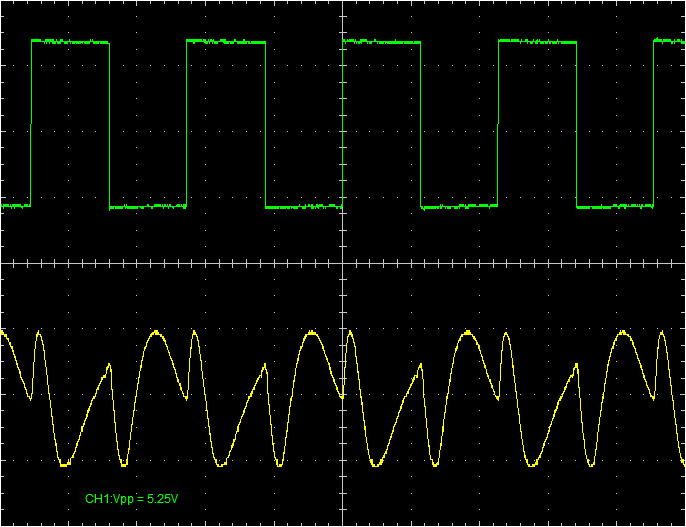 I’ve been working on building a mutant version (that is: with non-vintage components) of the timbre/symmetry section of the famous Buchla 259 complex waveform generator. I used the schematic Mark Verbos posted on his website as a starting point. I replaced all opamps with the TL072CN. All other components are common resistors (I used 1% metal film for all resistors), caps and diodes. When I finished the circuit I didn’t get any good waveform on the output on my first test. I tried inserting a sine wave at the input of the folding section and got better results after increasing the amplitude of the input signal. After checking the input circuit I found a 1:20 voltage divider at the audio input. So my 4 Vpp input sine wave was immediately attenuated to 200mVpp. After adjusting the voltage divider everything worked like it should. As far as I can tell from stuff I’ve seen on YouTube of real Buchla 259′s the waveforms definitely resemble the original. I’m happy with that as it was not my intention the built a 100% identical clone of the original. Here are some example of what waveforms can be achieved with this circuit. Input signal:…